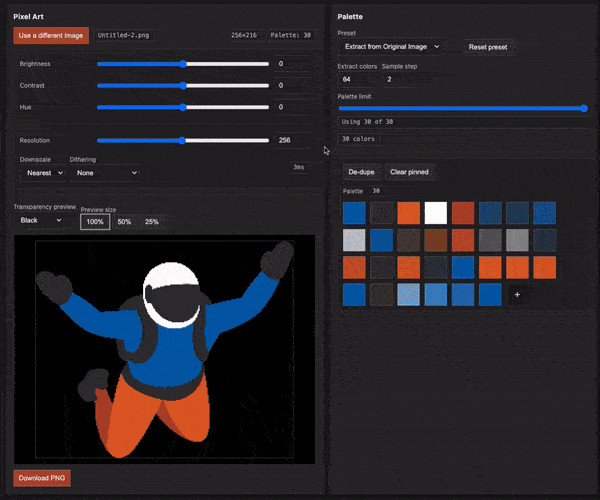 - You can change the preset to “Extract from different image” to upload a different image to base your palette on. This means you can upload another sprite from your game, a screenshot of a color palette, or a photo and apply that palette to the pixelized image.