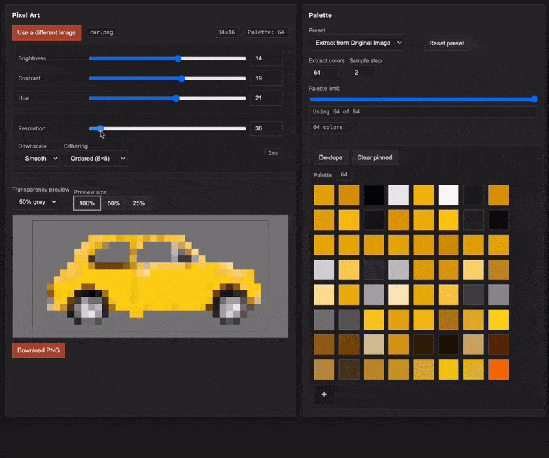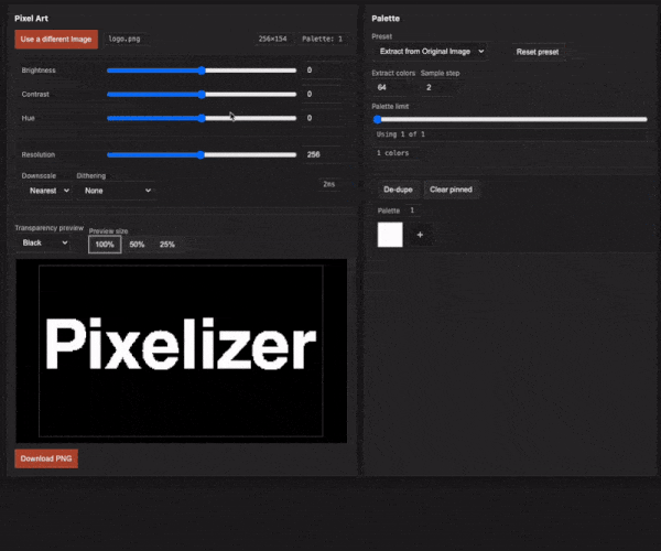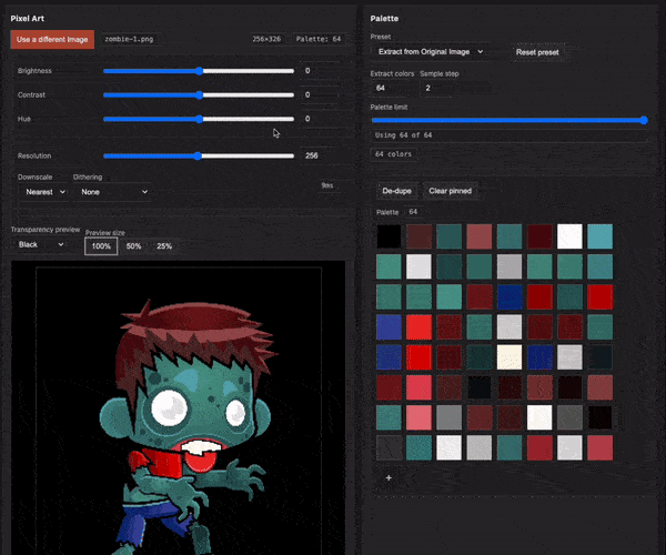 - Lastly, if you don’t like the way your palette is being applied to your image, you can make adjustments to the brightness, contrast, hue, downscale sampling, and dithering to change the way it is applied.
